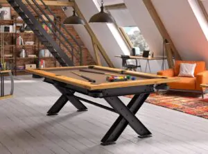 This billiard table, available in American or French billiards , will appeal to interior decoration enthusiasts with its crossed steel legs, a first in the world of billiards.